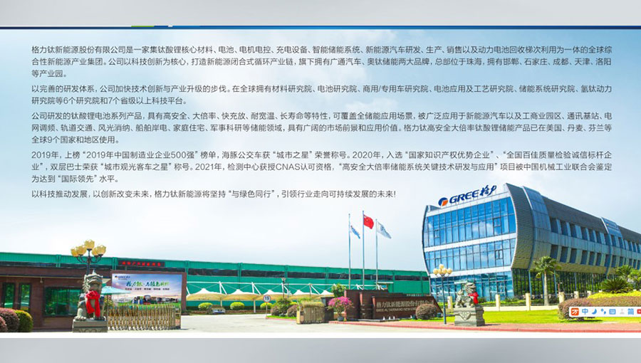格力鈦新能源股份有限公司是一家集鈦酸鋰核心材料、電池、電機電控、充電設(shè)備、智能儲能系統(tǒng)、新能源汽車研發(fā)、生產(chǎn)、銷售以及動力電池回收梯次利用為一體的全球綜合性新能源產(chǎn)業(yè)集團(tuán)。格力鈦以科技創(chuàng)新為核心,打造新能源閉合式循環(huán)產(chǎn)業(yè)鏈,旗下?lián)碛袕V通汽車、奧鈦儲能兩大品牌,總部位于珠海,擁有邯鄲、石家莊、成都、天津、洛陽、南京等產(chǎn)業(yè)園。