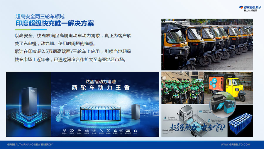 以完善的研發(fā)體系,格力鈦加快技術創(chuàng)新與產(chǎn)業(yè)升級的步伐。格力鈦研發(fā)的格力鈦電池安全性長期領跑行業(yè),憑借具有高安全、大倍率、快充放、耐寬溫、長壽命等特性,被選為“國家制造業(yè)單項冠軍產(chǎn)品”,廣泛應用于新能源汽車以及工商業(yè)園區(qū)、通訊基站、電網(wǎng)調(diào)頻、軌道交通、風光消納、船舶岸電、家庭住宅、軍事科研等儲能領域,具有廣闊的市場前景和應用價值。目前,格力鈦儲能產(chǎn)品已在丹麥、瑞士、芬蘭等全球30多個國家和地區(qū)使用,新能源汽車產(chǎn)品在北京、杭州、武漢、成都、青島、哈爾濱、包頭、??诘热?40多座城市運營,12年全球零電池事故安全運行。