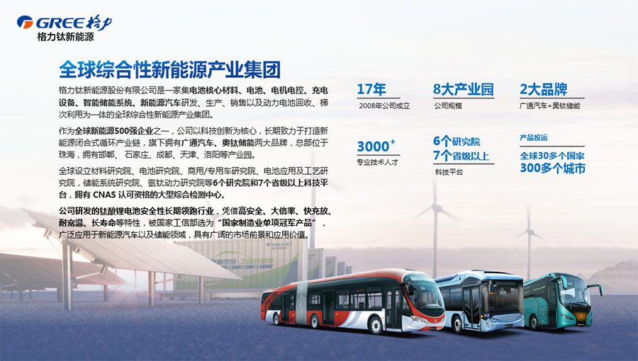 作為全球新能源500強企業(yè)之一,公司以科技創(chuàng)新為核心,長期致力于打造新能源閉合式循環(huán)產(chǎn)業(yè)鏈,旗下?lián)碛袕V通汽車、奧鈦儲能兩大品牌,總部位于珠海,擁有邯鄲、 石家莊、成都、天津、洛陽等產(chǎn)業(yè)園。