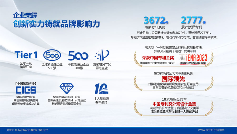 2022年,“一種鈦酸鋰復合材料及其制備方法、負極片及鋰離子電池”發(fā)明專利獲得中國專利金獎,摘得鋰電池行業(yè)內(nèi)的發(fā)明專利“首金”;2023年,該專利技術再次斬獲第75屆德國紐倫堡發(fā)明國際金獎。“高安全大倍率儲能系統(tǒng)關鍵技術研發(fā)與應用”項目被中國機械工業(yè)聯(lián)合會鑒定達到“國際領先”水平。截至目前,格力鈦先后獲得“中國民營企業(yè)制造業(yè)500強”、“全國質(zhì)量信得過產(chǎn)品”、“客車安全技術成果獎”、“中國儲能產(chǎn)業(yè)最具影響力企業(yè)獎、最佳系統(tǒng)集成商、最佳儲能電池供應商”等榮譽,獲得工信部頒發(fā)的“綠色工廠”榮譽稱號;上榜科技部發(fā)布的新能源領域獨角獸企業(yè),多年入選全球新能源企業(yè)500強,入選“全國百佳質(zhì)量檢驗誠信標桿企業(yè)”、“國家知識產(chǎn)權優(yōu)勢企業(yè)”等。