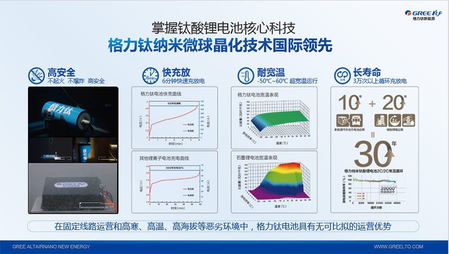 鈦酸鋰電池技術是新能源行業(yè)唯一獲得中國專利獎金獎的鋰電池產(chǎn)品技術,其應用于儲能電池和動力電池具有超高安全性,在快充放、耐寬溫、長壽命等方面同樣具有卓越的性能。格力鈦電池系列產(chǎn)品具有不起火不爆炸高安全、6分鐘快充放、-50℃至60℃耐寬溫特性,循環(huán)充放電次數(shù)高達30000多次,使用壽命長達30年。格力鈦電池經(jīng)利鋸切割、尖針穿刺、強力擠壓、電鉆沖孔、短路充放電、高溫加熱、槍擊等極限條件測試,均未發(fā)生冒煙、起火、燃燒、爆炸等現(xiàn)象。