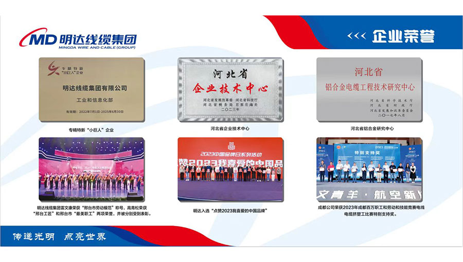 明達線纜先后被評為中國線纜企業(yè)百強、礦用橡套電纜企業(yè)十強、中國最具投標實力電線電纜供應商百強,國家高新技術企業(yè)、國家級專精特新小巨人企業(yè)、國家守合同重信用企業(yè)、全國質量誠信示范企業(yè)、點贊2023我喜愛的中國品牌、全國用戶滿意星級產(chǎn)品、河北省民營企業(yè)百強、河北省誠信企業(yè)、河北省產(chǎn)業(yè)集群龍頭企業(yè)、河北省企業(yè)技術中心、河北省制造業(yè)單項冠軍(鋁合金電纜)、河北省企業(yè)標準領跑者、河北省級標準化良好行為試點企業(yè)、河北省安全生產(chǎn)標準化企業(yè)、邢臺市政府質量獎、邢臺市智能電網(wǎng)及輸配電裝備產(chǎn)業(yè)鏈鏈主企業(yè)、邢臺市電線電纜協(xié)會會長單位等多項資質榮譽。