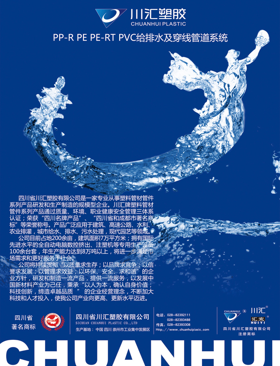 四川省川匯塑膠有限公司是一家專業(yè)從事塑料管材管件(PVC給排水管材、管件;電氣安裝用阻燃PVC塑料平導(dǎo)管(電工套管及配件);冷熱水用聚丙烯(PP-R)管材、管件;給水用聚乙烯(PE)管材、管件;燃?xì)庥寐竦鼐垡蚁≒E)管材、管件;高密度聚乙烯(HDPE)雙壁纏繞管材、管件;埋地排水用鋼帶增強(qiáng)聚乙烯(PE)螺旋波紋管;聚乙烯(PE)雙壁波紋管材;冷熱水用PE-RT耐熱聚乙烯地暖管材、管件;C-PVC地埋式高壓電力電纜保護(hù)管;川匯牌“匯騰”家裝精品等)、塑膠型材、塑鋼門窗、金屬管道、金屬管道的接頭及配件、球墨鑄鐵管及管件系列產(chǎn)品研發(fā)和生產(chǎn)制造的規(guī)模型企業(yè)。其產(chǎn)品廣泛應(yīng)用于建筑、高速公路、水利、農(nóng)業(yè)排灌,城市給水、排水、污水處理,現(xiàn)代園藝等領(lǐng)域。