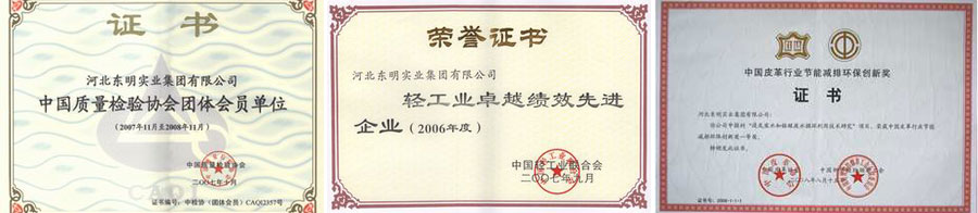 河北東明實(shí)業(yè)集團(tuán)有限公司創(chuàng)建于1996年,集團(tuán)下屬河北東明皮革有限公司、河北東明制衣有限公司、河北東明牛皮制革有限公司、東明金興制衣有限公司、東明酒店、東明商廈、河北東明中硅科技有限公司、辛集市東明房地產(chǎn)開發(fā)有限公司八個(gè)子公司。集團(tuán)是按高標(biāo)準(zhǔn)、高起點(diǎn)、嚴(yán)要求興建的辛集地方特色產(chǎn)業(yè),經(jīng)過幾年的不懈努力,已發(fā)展成擁有職工3000人,制革能力和產(chǎn)量在全國(guó)制革業(yè)中居前位,其中綿羊皮服裝革產(chǎn)銷量列第一位的中型民營(yíng)企業(yè)。獲得國(guó)家星火計(jì)劃獎(jiǎng)、國(guó)家農(nóng)副產(chǎn)品加工龍頭企業(yè)、國(guó)家優(yōu)秀鄉(xiāng)鎮(zhèn)企業(yè)、全國(guó)外商投資先進(jìn)企業(yè)、全國(guó)雙愛雙評(píng)先進(jìn)企業(yè);獲河北省著名商標(biāo)、河北省名牌、河北省質(zhì)量效益型先進(jìn)企業(yè)、河北省重合同守信用單位、河北省百強(qiáng)企業(yè)和石家莊市50強(qiáng)企業(yè)等80多個(gè)國(guó)家級(jí)獎(jiǎng)項(xiàng)和榮譽(yù)稱號(hào)。集團(tuán)在皮革行業(yè)樹立的良好聲譽(yù)使東明成為高品質(zhì)的代名詞,可信賴的經(jīng)營(yíng)作風(fēng)更獲得世界各地客戶贊賞!集團(tuán)近年來不斷加大技改投入,先后投入3個(gè)億人民幣進(jìn)行技術(shù)改造,投入2000萬進(jìn)行環(huán)保污水處理,經(jīng)過不斷的創(chuàng)新改造,在環(huán)境保護(hù)和環(huán)境治理上取得了可喜成就。其中,無灰浸鞣、廢灰夜循環(huán)利用、廢鉻液循環(huán)利用工藝技術(shù),獲河北省科技廳科技成果獎(jiǎng),并在全國(guó)皮革行業(yè)推廣,取得豐厚的企業(yè)經(jīng)濟(jì)效益和社會(huì)效益。2009年獲全國(guó)輕工行業(yè)“節(jié)能減排環(huán)保創(chuàng)新獎(jiǎng)”。獲得全國(guó)“五一勞動(dòng)獎(jiǎng)狀”。河北東明實(shí)業(yè)集團(tuán)有限公司產(chǎn)品質(zhì)量獲得國(guó)家真皮生態(tài)皮革稱號(hào)、辛集市利稅大戶。近年來向社會(huì)捐資500萬用于公益事業(yè)?,F(xiàn)在集團(tuán)勞動(dòng)關(guān)系和諧,曾被國(guó)家評(píng)為“雙評(píng)雙愛”先進(jìn)單位。多次被省評(píng)為“重合同守信用”企業(yè),客戶對(duì)產(chǎn)品質(zhì)量滿意率一直在99%以上,客戶對(duì)產(chǎn)品售后服務(wù)滿意度在99%以上。集團(tuán)成立以來致力于生產(chǎn)高質(zhì)量的產(chǎn)品,“以誠信為根本,視質(zhì)量為生命”是東明人一貫遵循的準(zhǔn)則,也正是對(duì)這一目標(biāo)的不懈追求使公司不斷的發(fā)展壯大。集團(tuán)生產(chǎn)的綿羊服裝革,以其色澤均勻、手感柔軟著稱,不僅在國(guó)內(nèi)有很高的聲譽(yù),還贏得了國(guó)外許多廠家的青睞,已打入美國(guó)、加拿大、韓國(guó)、俄羅斯、香港等國(guó)外市場(chǎng)。