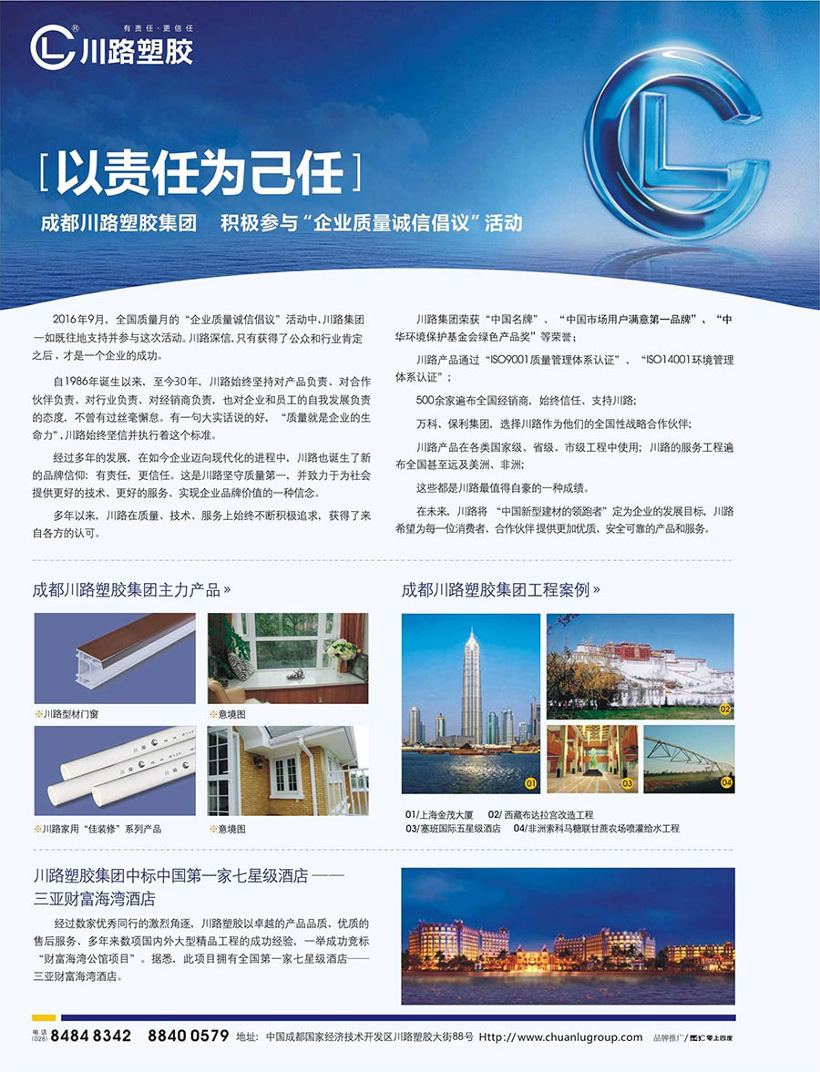 川路塑膠集團是四川省高新技術(shù)企業(yè)和政府培育型大企業(yè),是中國塑料加工工業(yè)協(xié)會理事及管道分會副理事長單位和全國塑料制品標(biāo)準(zhǔn)化技術(shù)委員會委員兼SC3副主任委員單位。擁有國家授權(quán)的博士后科研工作站及數(shù)項國家產(chǎn)品專利,是四川大學(xué)高分子材料實驗基地,榮獲了中國名牌、中國環(huán)境標(biāo)志產(chǎn)品榮譽稱號,通過了ISO9001質(zhì)量管理體系認證、ISO14001環(huán)境管理體系認證、GB/T28001-2001職業(yè)健康管理體系等認證,被評為中國市場用戶滿意第一品牌及中國管材管件業(yè)最具影響力品牌稱號。
