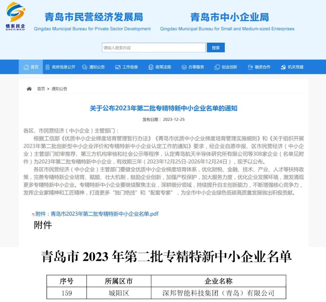 12月25日,青島市民營經(jīng)濟(jì)發(fā)展局發(fā)布了《關(guān)于公示2023年第二批專精特新中小企業(yè)名單的通知》,深邦集團(tuán)憑借卓越的創(chuàng)新技術(shù)、完善的產(chǎn)品體系、高效的運(yùn)營模式以及穩(wěn)健的經(jīng)營實(shí)力順利通過層層審核,獲評2023年第二批“專精特新”中小企業(yè)。