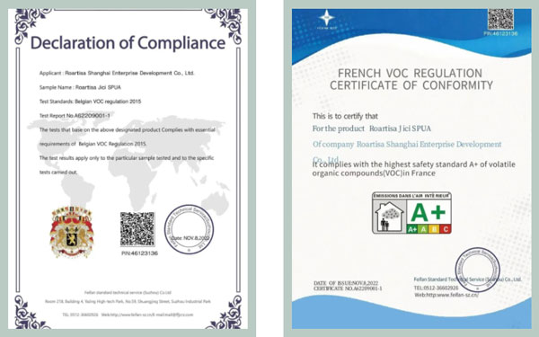 皇氏工匠美縫產(chǎn)品擁有非常全的環(huán)保檢測項目,不僅通過國內(nèi)數(shù)項權(quán)威環(huán)保檢測,還獲得了多項國際環(huán)保認(rèn)證,包括法國A+認(rèn)證、比利時皇家認(rèn)證、德國AgBB等。