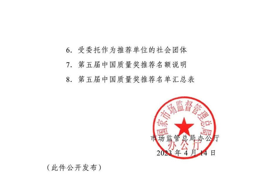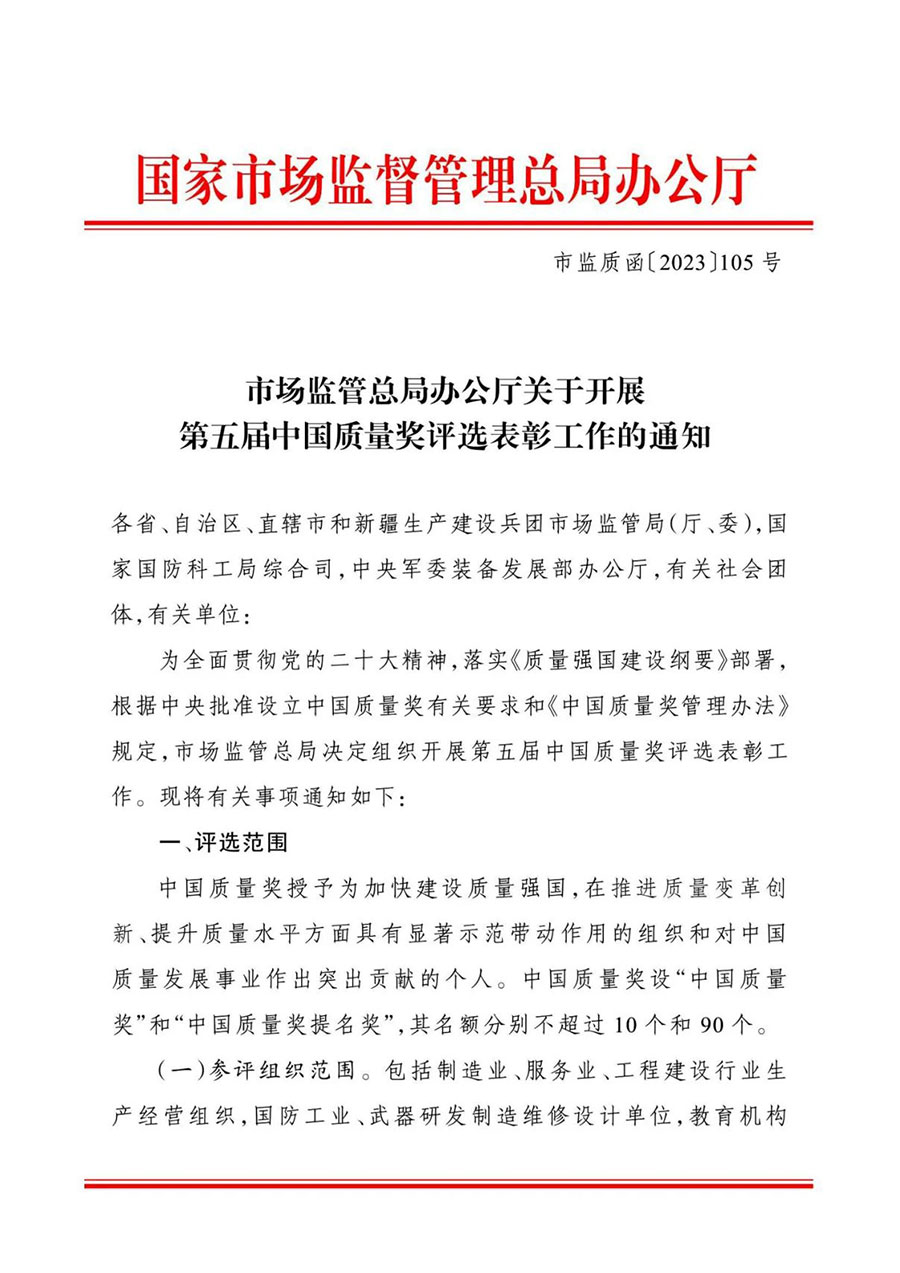 為全面貫徹黨的二十大精神,落實(shí)《質(zhì)量強(qiáng)國(guó)建設(shè)綱要》部署,根據(jù)中央批準(zhǔn)設(shè)立中國(guó)質(zhì)量獎(jiǎng)有關(guān)要求和《中國(guó)質(zhì)量獎(jiǎng)管理辦法》規(guī)定,市場(chǎng)監(jiān)管總局決定組織開(kāi)展第五屆中國(guó)質(zhì)量獎(jiǎng)評(píng)選表彰工作?,F(xiàn)將有關(guān)事項(xiàng)通知如下: