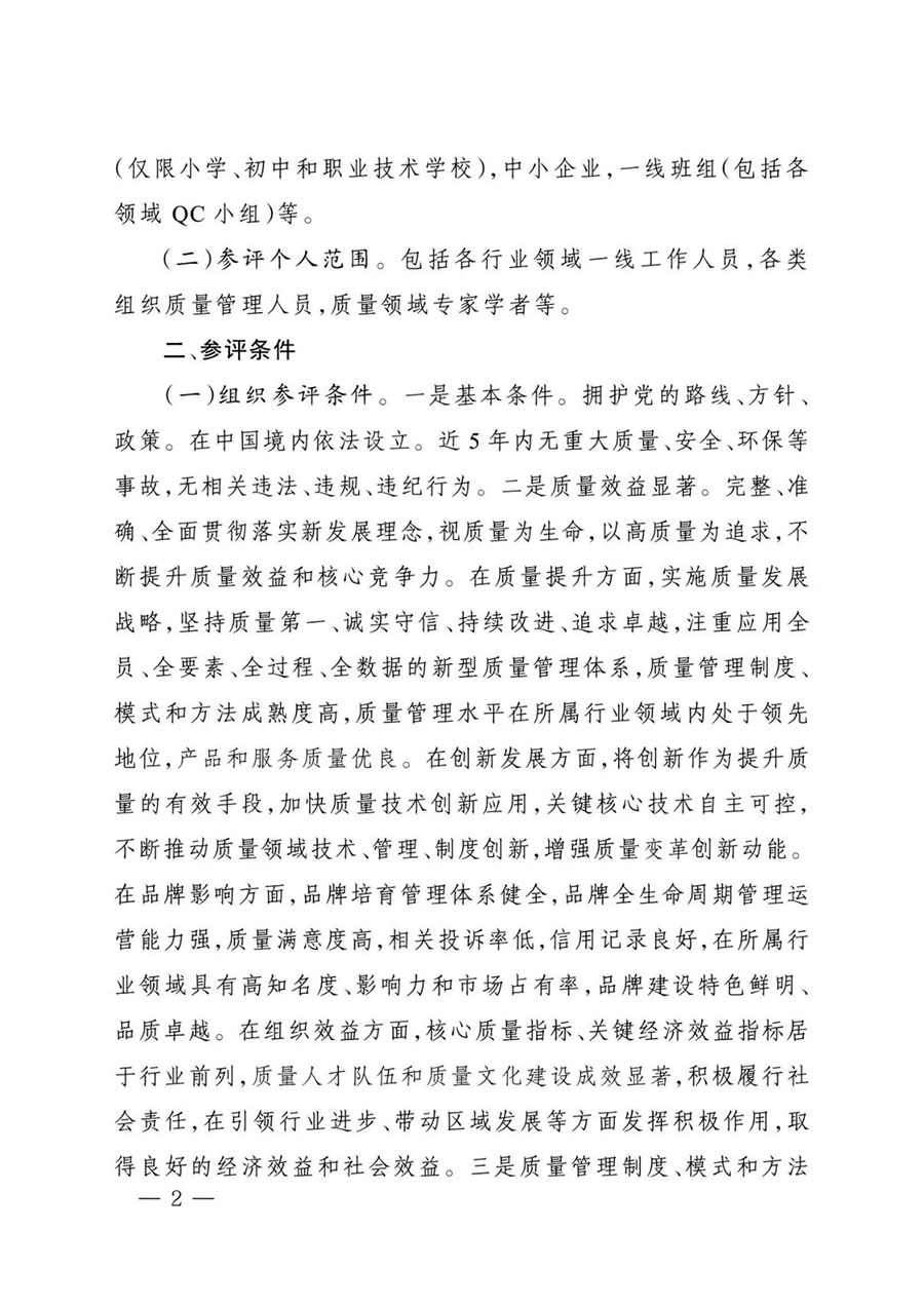 (一)組織參評(píng)條件。一是基本條件。擁護(hù)黨的路線(xiàn)、方針、政策。在中國(guó)境內(nèi)依法設(shè)立。近5年內(nèi)無(wú)重大質(zhì)量、安全、環(huán)保等事故,無(wú)相關(guān)違法、違規(guī)、違紀(jì)行為。二是質(zhì)量效益顯著。完整、準(zhǔn)確、全面貫徹落實(shí)新發(fā)展理念,視質(zhì)量為生命,以高質(zhì)量為追求,不斷提升質(zhì)量效益和核心競(jìng)爭(zhēng)力。在質(zhì)量提升方面,實(shí)施質(zhì)量發(fā)展戰(zhàn)略,堅(jiān)持質(zhì)量第一、誠(chéng)實(shí)守信、持續(xù)改進(jìn)、追求卓越,注重應(yīng)用全員、全要素、全過(guò)程、全數(shù)據(jù)的新型質(zhì)量管理體系,質(zhì)量管理制度、模式和方法成熟度高,質(zhì)量管理水平在所屬行業(yè)領(lǐng)域內(nèi)處于領(lǐng)先地位,產(chǎn)品和服務(wù)質(zhì)量?jī)?yōu)良。在創(chuàng)新發(fā)展方面,將創(chuàng)新作為提升質(zhì)量的有效手段,加快質(zhì)量技術(shù)創(chuàng)新應(yīng)用,關(guān)鍵核心技術(shù)自主可控,不斷推動(dòng)質(zhì)量領(lǐng)域技術(shù)、管理、制度創(chuàng)新,增強(qiáng)質(zhì)量變革創(chuàng)新動(dòng)能。在品牌影響方面,品牌培育管理體系健全,品牌全生命周期管理運(yùn)營(yíng)能力強(qiáng),質(zhì)量滿(mǎn)意度高,相關(guān)投訴率低,信用記錄良好,在所屬行業(yè)領(lǐng)域具有高知名度、影響力和市場(chǎng)占有率,品牌建設(shè)特色鮮明、品質(zhì)卓越。在組織效益方面,核心質(zhì)量指標(biāo)、關(guān)鍵經(jīng)濟(jì)效益指標(biāo)居于行業(yè)前列,質(zhì)量人才隊(duì)伍和質(zhì)量文化建設(shè)成效顯著,積極履行社會(huì)責(zé)任,在引領(lǐng)行業(yè)進(jìn)步、帶動(dòng)區(qū)域發(fā)展等方面發(fā)揮積極作用,取得良好的經(jīng)濟(jì)效益和社會(huì)效益。三是質(zhì)量管理制度、模式和方法可示范可推廣。通過(guò)質(zhì)量管理創(chuàng)新,結(jié)合實(shí)踐總結(jié)提煉出獨(dú)具特色、國(guó)內(nèi)領(lǐng)先、國(guó)際先進(jìn)且具有應(yīng)用推廣價(jià)值的質(zhì)量管理制度、模式和方法。發(fā)揮引領(lǐng)作用,將質(zhì)量管理的成功經(jīng)驗(yàn)和先進(jìn)方法向全行業(yè)和產(chǎn)業(yè)鏈兩端延伸推廣,推動(dòng)加強(qiáng)全面質(zhì)量管理,促進(jìn)質(zhì)量升級(jí),為建設(shè)現(xiàn)代化產(chǎn)業(yè)體系作出貢獻(xiàn)。