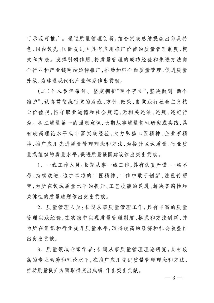 (二)參評(píng)個(gè)人范圍。包括各行業(yè)領(lǐng)域一線(xiàn)工作人員,各類(lèi)組織質(zhì)量管理人員,質(zhì)量領(lǐng)域?qū)<覍W(xué)者等。