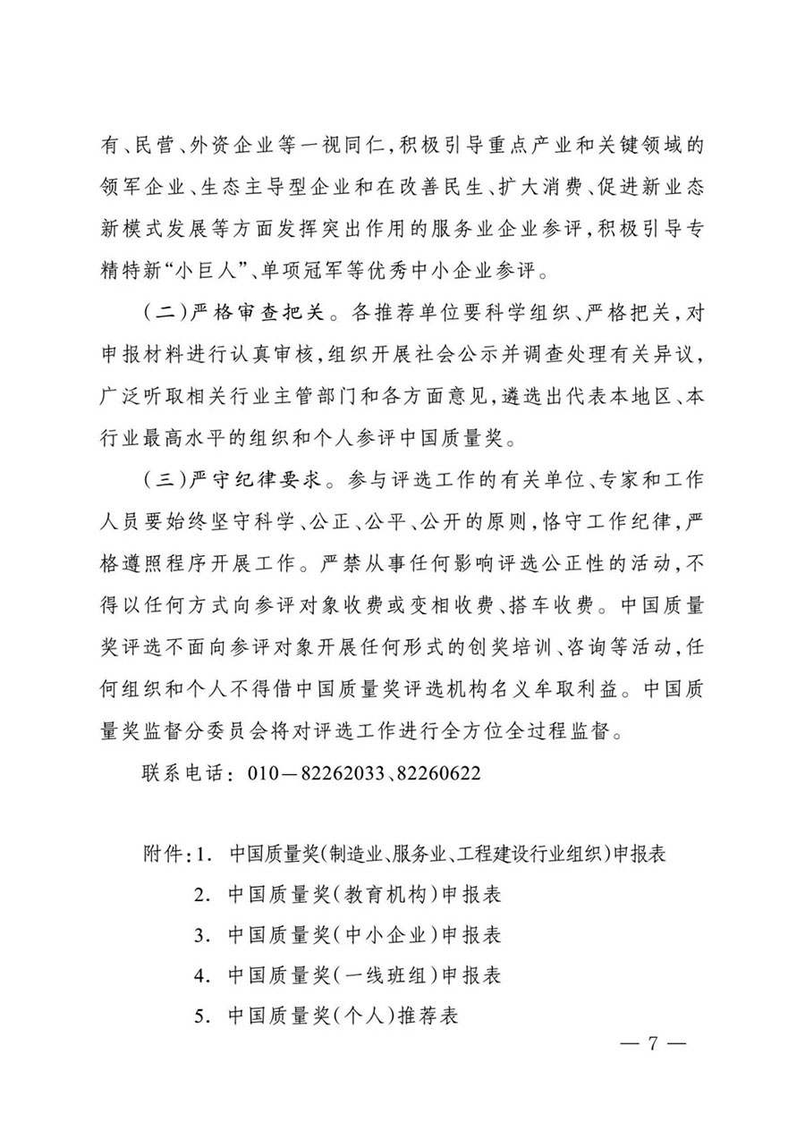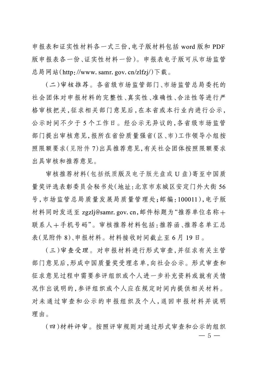 審核推薦材料(包括紙質(zhì)版及電子版光盤(pán)或U盤(pán))寄至中國(guó)質(zhì)量獎(jiǎng)評(píng)選表彰委員會(huì)秘書(shū)處(地址:北京市東城區(qū)安定門(mén)外大街56號(hào),市場(chǎng)監(jiān)管總局質(zhì)量發(fā)展局質(zhì)量管理處;郵編:100011),電子版材料同時(shí)發(fā)送至zgzlj@samr.gov.cn,郵件標(biāo)題為“推薦單位名稱(chēng)+聯(lián)系人+手機(jī)號(hào)碼”。審核推薦材料包括:推薦函、推薦名單匯總表(見(jiàn)附件8)、申報(bào)材料。材料接收時(shí)間截止至6月19日。