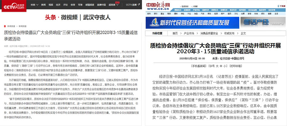 中國經(jīng)濟網(wǎng)《質(zhì)檢協(xié)會持續(xù)倡議廣大會員響應“三保”行動并組織開展2020年3·15質(zhì)量誠信承諾活動》