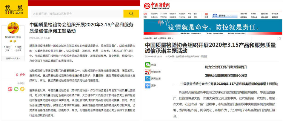 搜狐網(wǎng)《中國質(zhì)量檢驗協(xié)會組織開展2020年3.15產(chǎn)品和服務質(zhì)量誠信承諾主題活動》