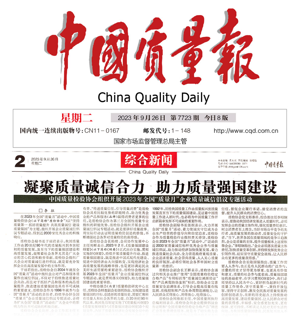 - 中國質(zhì)量報(bào)——凝聚質(zhì)量誠信合力 助力質(zhì)量強(qiáng)國建設(shè)——中國質(zhì)量檢驗(yàn)協(xié)會(huì)組織開展2023年全國“質(zhì)量月”企業(yè)質(zhì)量誠信倡議專題活動(dòng)